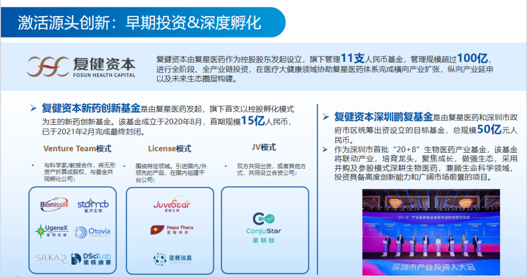 其中,复健资本专门设立了聚焦源头创新的新药创新基金,参与方包括社会资本和地方政府等,首期规模15亿元,孵化了10家公司,包含6家技术平台型公司。