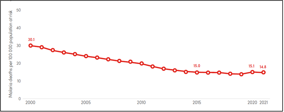 图:2000-2021全球疟疾死亡率变化趋势(折算至每100000名高危人群的死亡数)(数据来源:WHO《世界疟疾报告2022》)