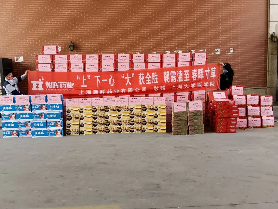朝晖药业通过医学院张川教授向学院无偿捐赠12000只口罩、50箱水果、1200盒方便面、200箱面包饼干、600盒牛奶、1200瓶饮料。上海大学党委副书记、校长刘昌胜,副校长王从春一行来到物资分发现场,刘校长通过微信视频向朝晖药业总经理王燕表示感谢。王燕表示愿为学校抗疫尽一份绵薄之力,共同迎接战疫胜利的曙光。